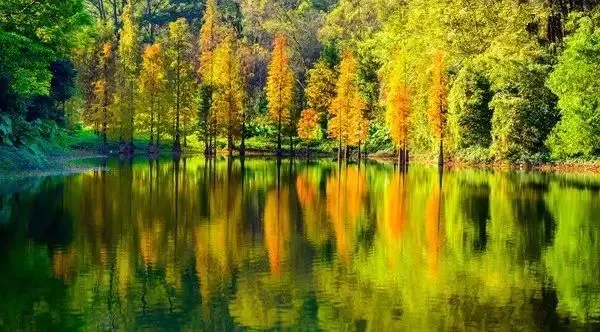 一棵棵落羽杉静静矗立金黄、褐红的枝叶相互交叠游船的动与水边杉林的静交相辉映美的让人不忍离开